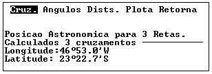 Para inserir as retas manualmente, use o comando Retas Edita Manual. No caso de retas calculadas pelo programa, você pode salvar usando o comando Retas Salva. Inserindo as retas e usando o comando Calc Pos astronom teremos o resultado: