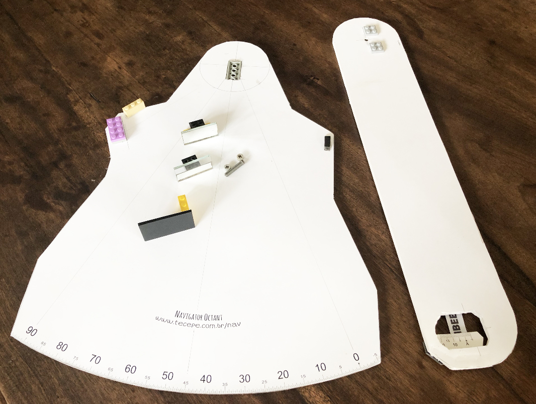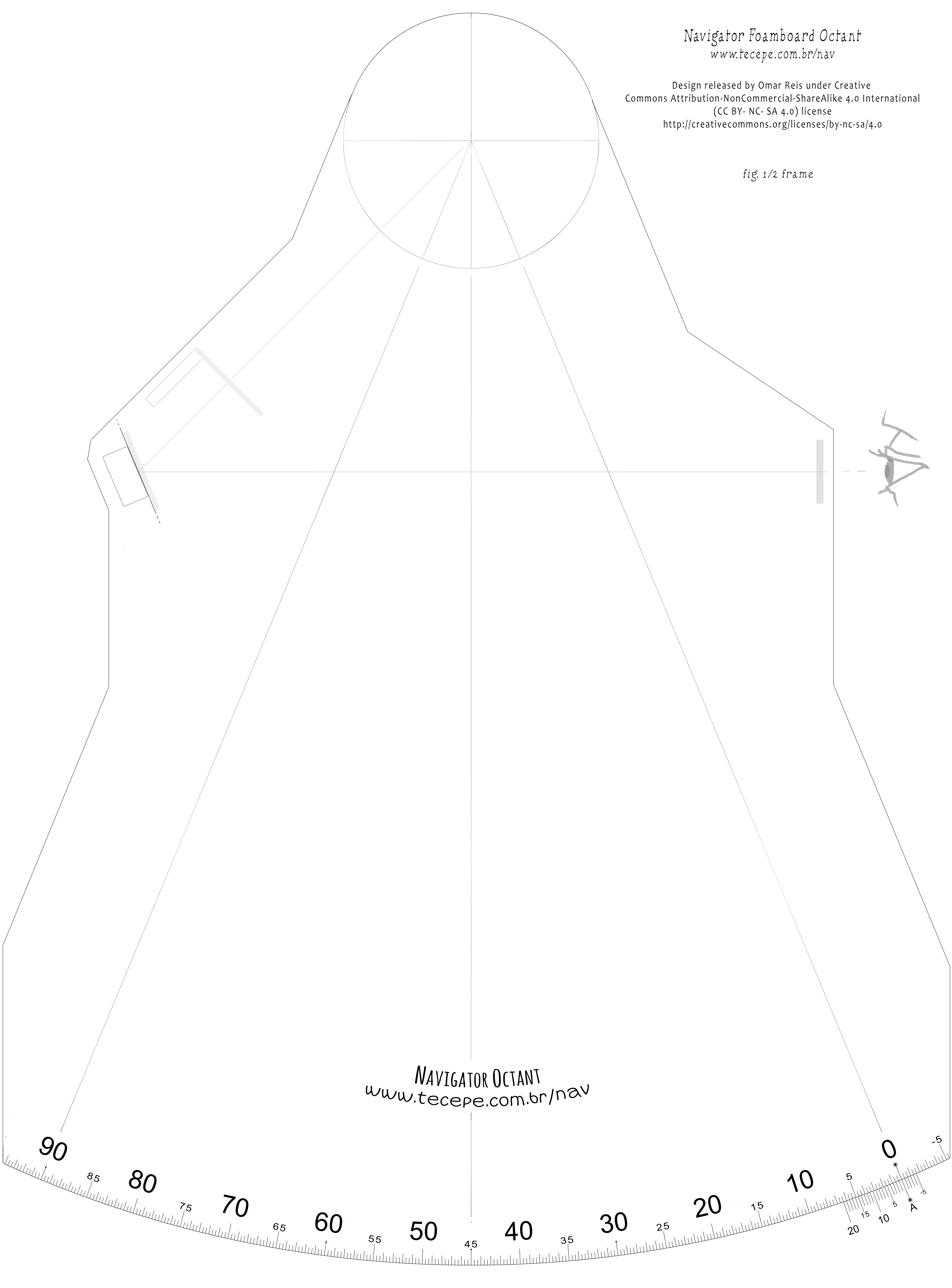 The Foamboard Octant project Sextants and Octants are similar instruments. Both measure angles and are used in celestial navigation. The sextant has this name because its scale is one sixth of the full circle ( 60 degrees ). The Octant scale is thinner: 1/8 of the circle or 45 degrees. The instrument optics are the same with a scale of two arc degrees per degree ( so the octant, with its 45 degree scale, can measure up to 90 degree angles) Modern celestial navigation instruments are smaller than old ones. This shrinking was possible by precision optics and mechanics. In the old times, when instruments were made of wood, precision was obtained by increased sizes. For those large instruments, the octant design was more convenient than the sextant, because it is slender. This DIY project is like those old octants. It is large in size, making it possible to read angles within a couple minutes.