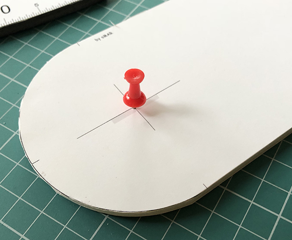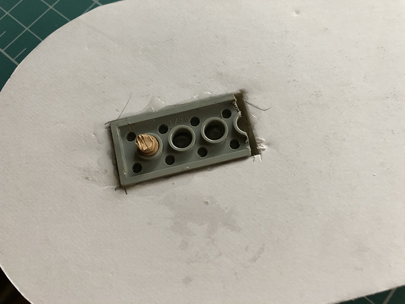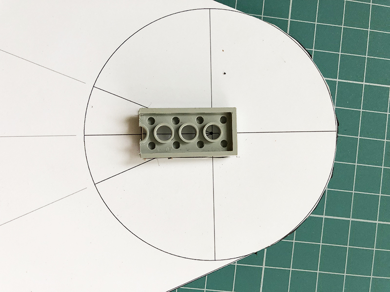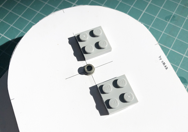 The shallow bricks used are conveniently about the same thickness of the foamboard ( about 4 mm). The axis bricks were bonded to the foamboard with epoxy two component glue (30 minutes cure time). As it cures, the epoxy hardens and joints the brick and foamboard firmly. Any force the axis receives is distributed to the board evenly, to avoid axis displacement. In preparation to the bonding operation, position the Lego brick over the frame so that the axis hole center coincides with the printed center. Trace the brick outline with a pencil.