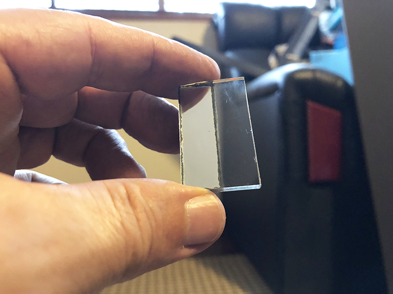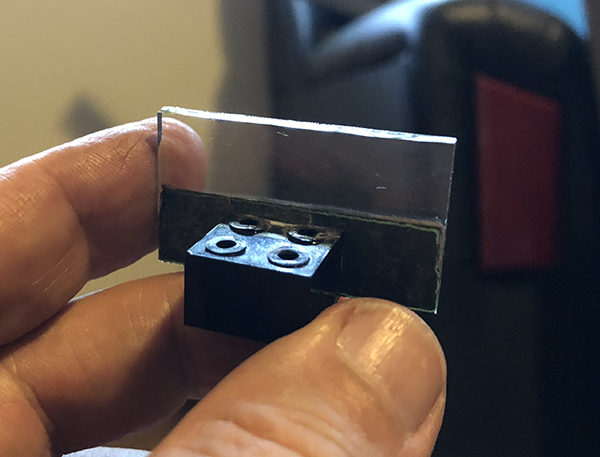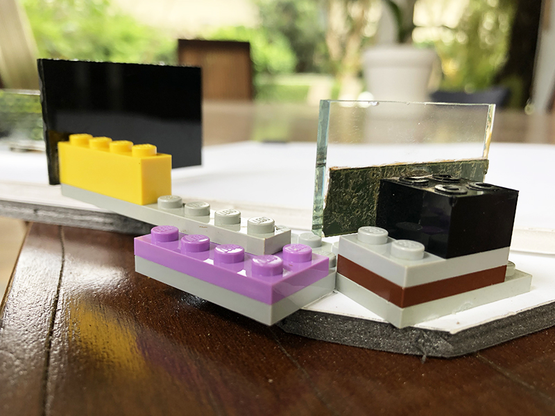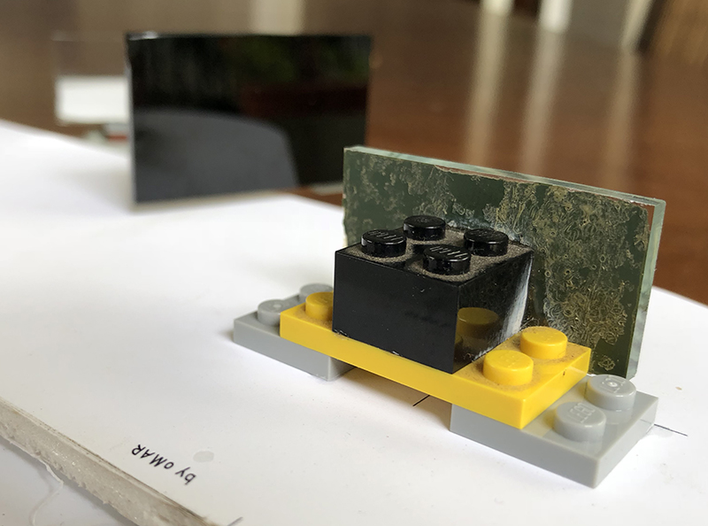 After a while you have your new half silvered mirror. To mount the mirrors to the frame and arm, they were bonded to regular sized Lego bricks (10mm thick). I used 2x2 bricks. For the semi-transparent mirror I had to cut out the 4 brick bumps ( because I could see their tips through the transparent part, which is also 10 mm )