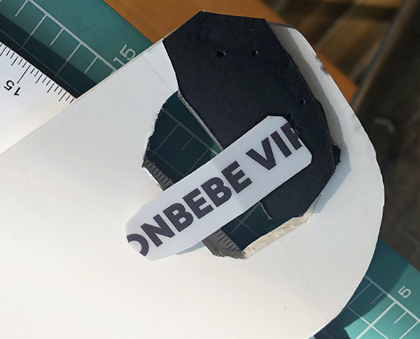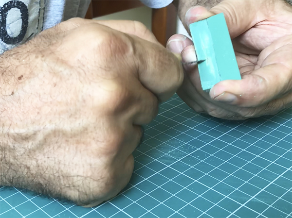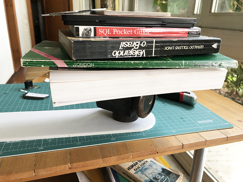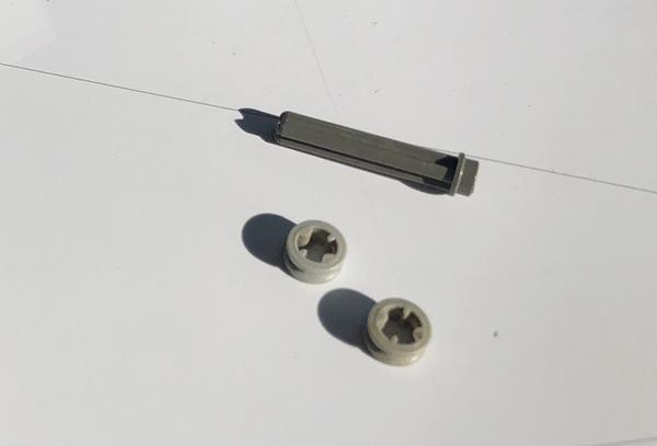 Mix a small quantity of the epoxy glue (equal parts of the two components), and drop it on the rectangular pool on the foamboard. Spread the glue evenly. Insert the brick, so that the piece and foamboard surfaces are about even. Clean up any epoxy that overflows. Allow some 15 minutes for the epoxy to half-cure. Now hold the brick and gently remove the axis hole protection rolls, before they get too tightly attached to the epoxy. Make sure not to contaminate the axis hole with epoxy, or displace the brick while removing the roll. Press the brick on a flat surface and allow the glue to cure for a couple hours.