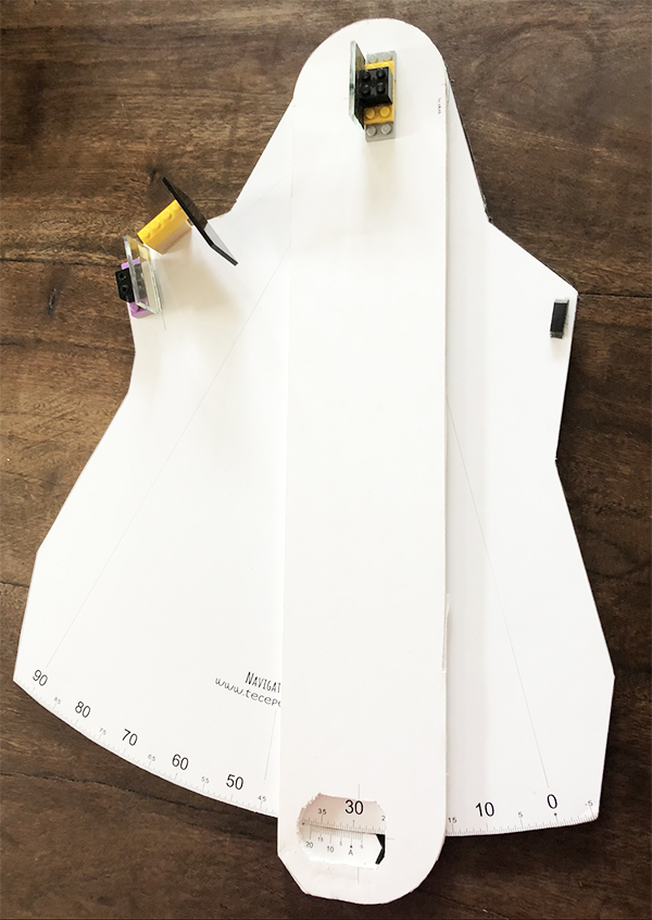 With a sharp paper cutter, cut the frame and arm pieces . Cut the main scale arc very carefully. Smooth the arc foam with sand paper. Note that the main scale and arm scale (Vernier) must touch each other and the arm rotation must be smooth across the whole arc. Also cut off the arm window. The arm axis The arm axis setup must be sturdy and allow arm rotation, without slack. The foamboard itself is not capable of that (too soft), so I choose to use Lego pieces with axis holes, which were embedded to the foamboard.