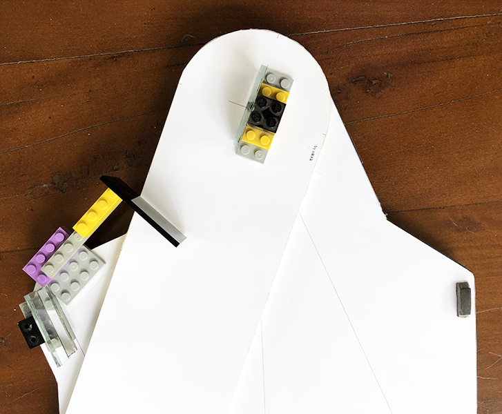 Cut out the top layer of paper of the foamboard ( the rectangle to fit the Lego piece in ). Scratch the foam out, leaving only the bottom paper layer untouched. In the Lego bricks, protect the axis hole to avoid epoxy contamination. I used adhesive tape rolls for that, fitted to the hole diameter ( 5 mm )