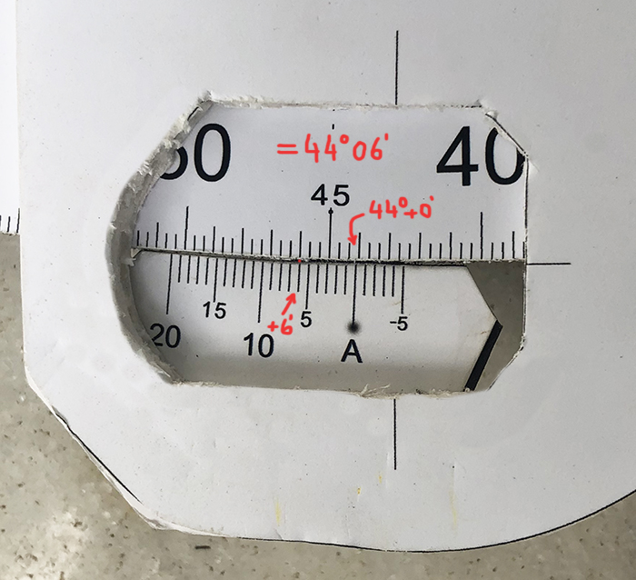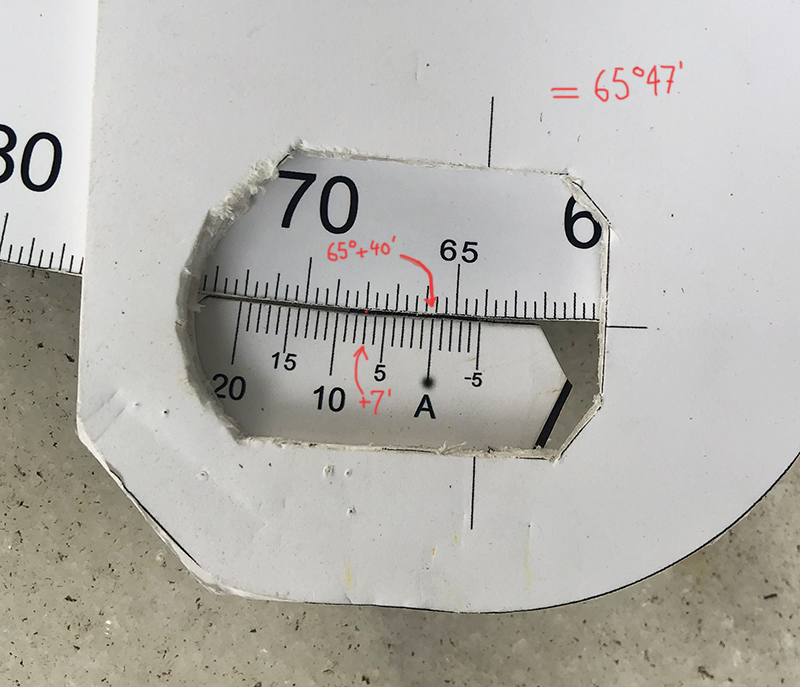 Vernier The Vernier is a kind of scale used before micrometer screws found in modern instruments. In the case of this octant, each degree of the main scale is divided in 3 parts, each 20 minutes of arc wide. The A tick in the Vernier points the measured angle.