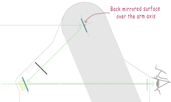 Use 1 extra shallow brick on the frame mirror tower, so that both mirrors are at the same height in relation to instrument plane. The arm mirror tower, attached to the arm, is lower. The arm mirror must be positioned so that its mirrored surface (i.e. the back of the mirror ) is over the center of the axis, and it pivots on that axis. In order to avoid interference between the instrument axis and the arm mirror, I chose a shaft with a small head.