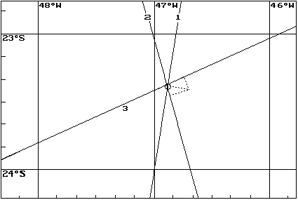 Se os dados estiverem corretos e os resultados forem compatíveis com o esperado, salve a reta com o comando Retas Salva. Repita então o procedimento de cálculo de retas de altura para outros astros. Você pode salvar até 5 retas de altura de cada vez. Tendo salvo duas ou mais retas, você pode obter a Posição Astronômica através do comando Calc Pos astronômica.