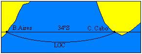 Tomemos, por exemplo, o percurso entre Buenos Aires (58°20'W, 34°25'S) e Cidade do Cabo (18°20'E, 34°10'S). As duas cidades tem quase a mesma latitude. Assim, o rumo "reto" entre os dois pontos em uma projeção de Mercator seria 90° (rumo leste) e a distância de 3813 milhas. A Linha de Grande Círculo entre as duas cidades tem rumo inicial 114° (Leste-Sudeste) e distância de 3699 milhas, um percurso 114 milhas mais curto. Observe a diferença de 24° entre o rumo reto da carta de Mercator e o rumo inicial da LGC. Nas proximidades da Cidade do Cabo, o rumo da mesma LGC é 66° (Leste-Nordeste). Em latitudes maiores essa diferença é ainda mais pronunciada.